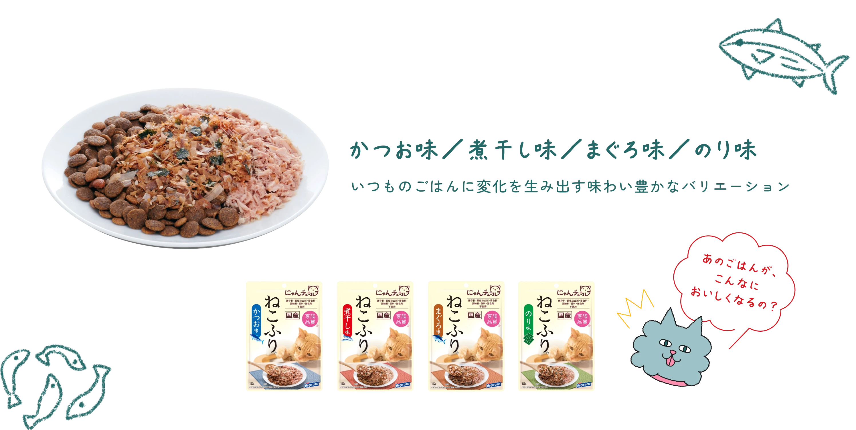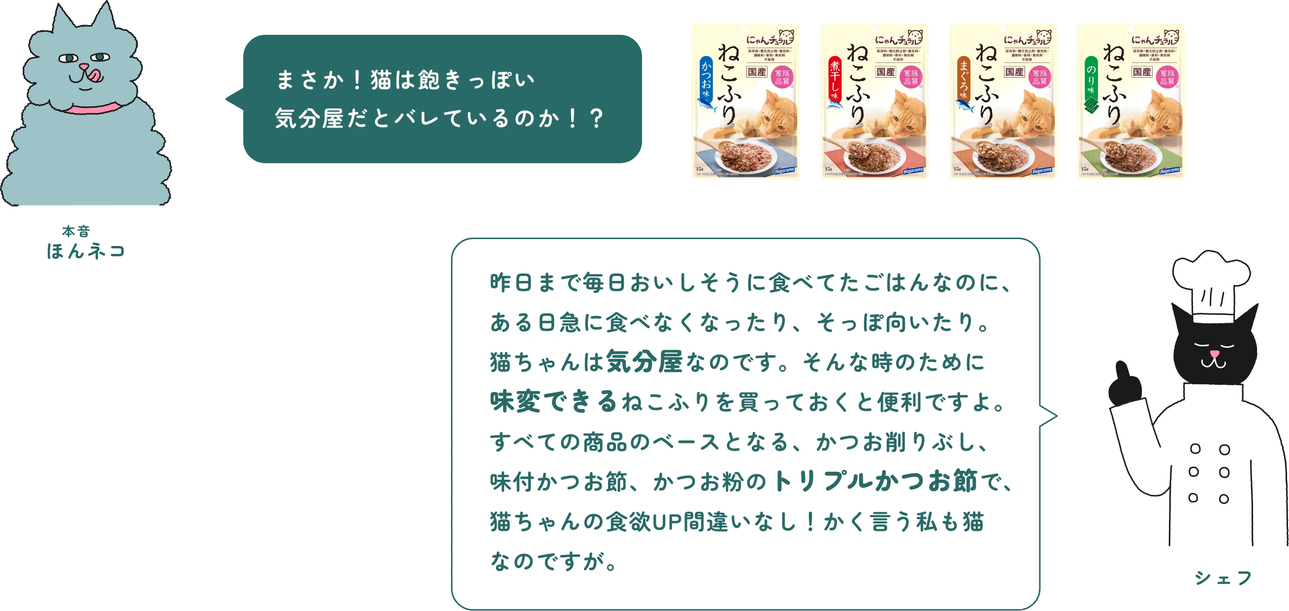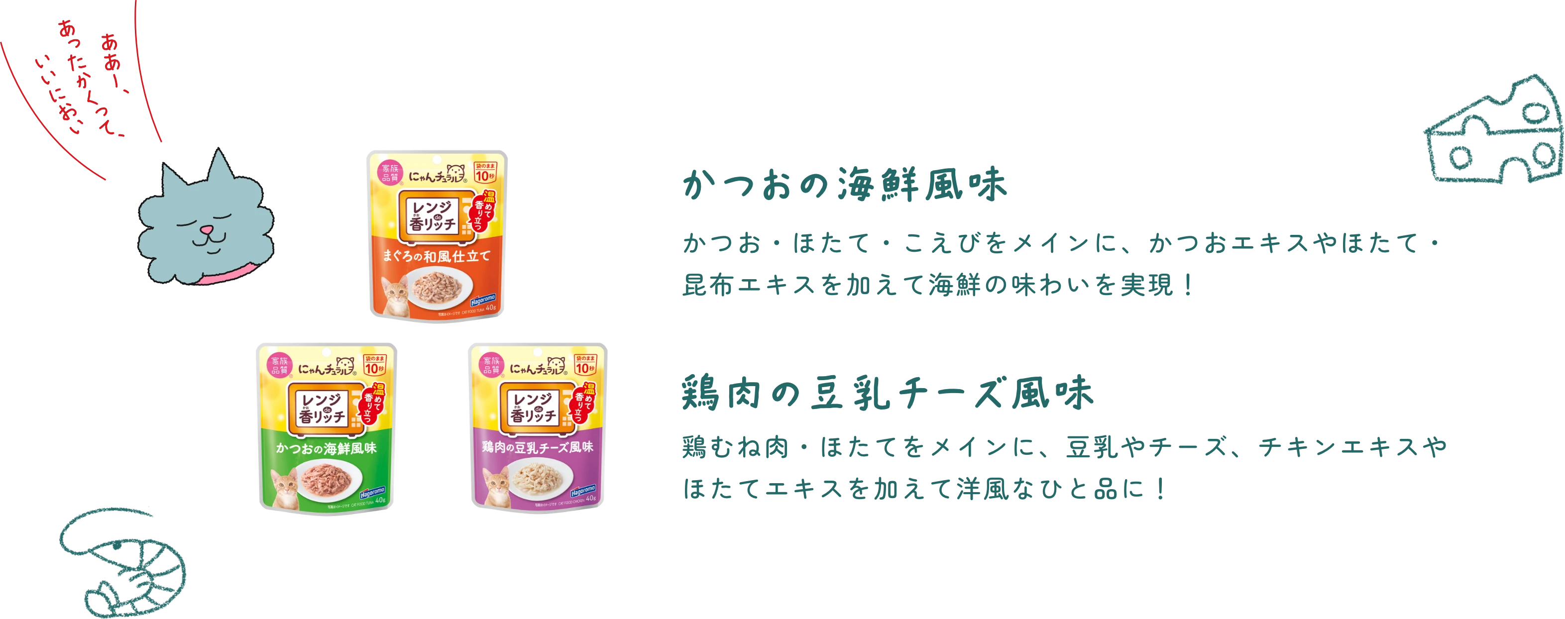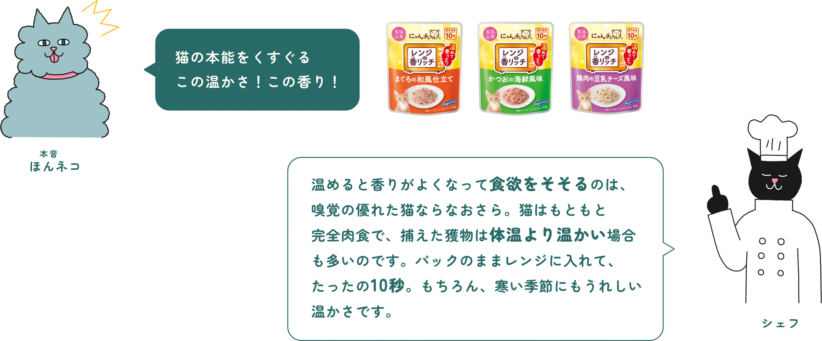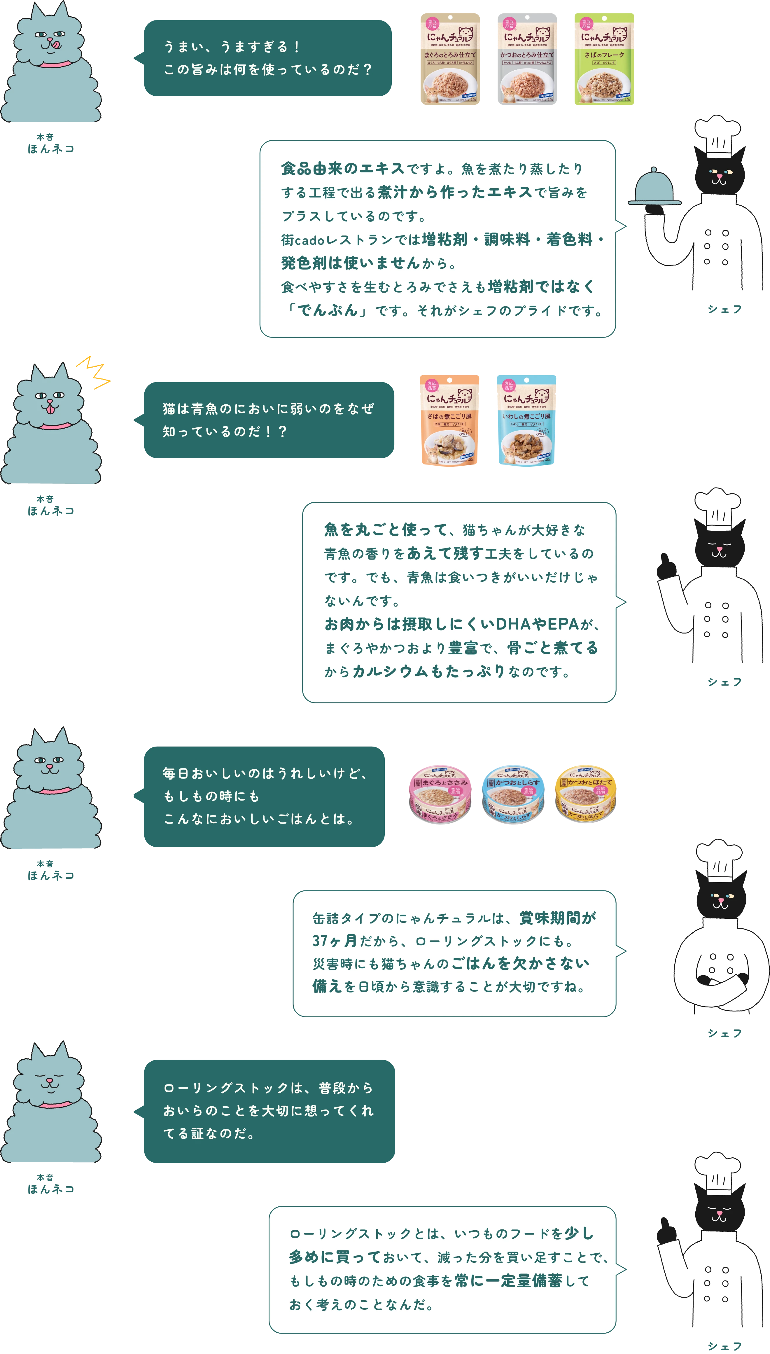 ※当店の食事は増粘剤・調味料・着色料・発色剤 不使用です。 にゃんチュラル® にゃんチュラルのおいしさの秘密 レンジde香リッチ® レンジde香リッチのおいしさの秘密 ねこふり® ねこふりのおいしさの秘密 手作りレシピ レシピはコチラから